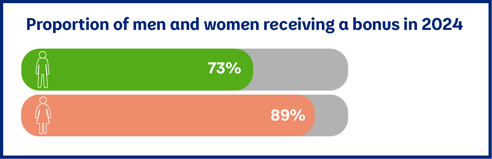 We calculate our bonuses pro rata for those joining part-way through the performance year. In 2024, 96% of new joiners receiving pro rata bonus payments were women.